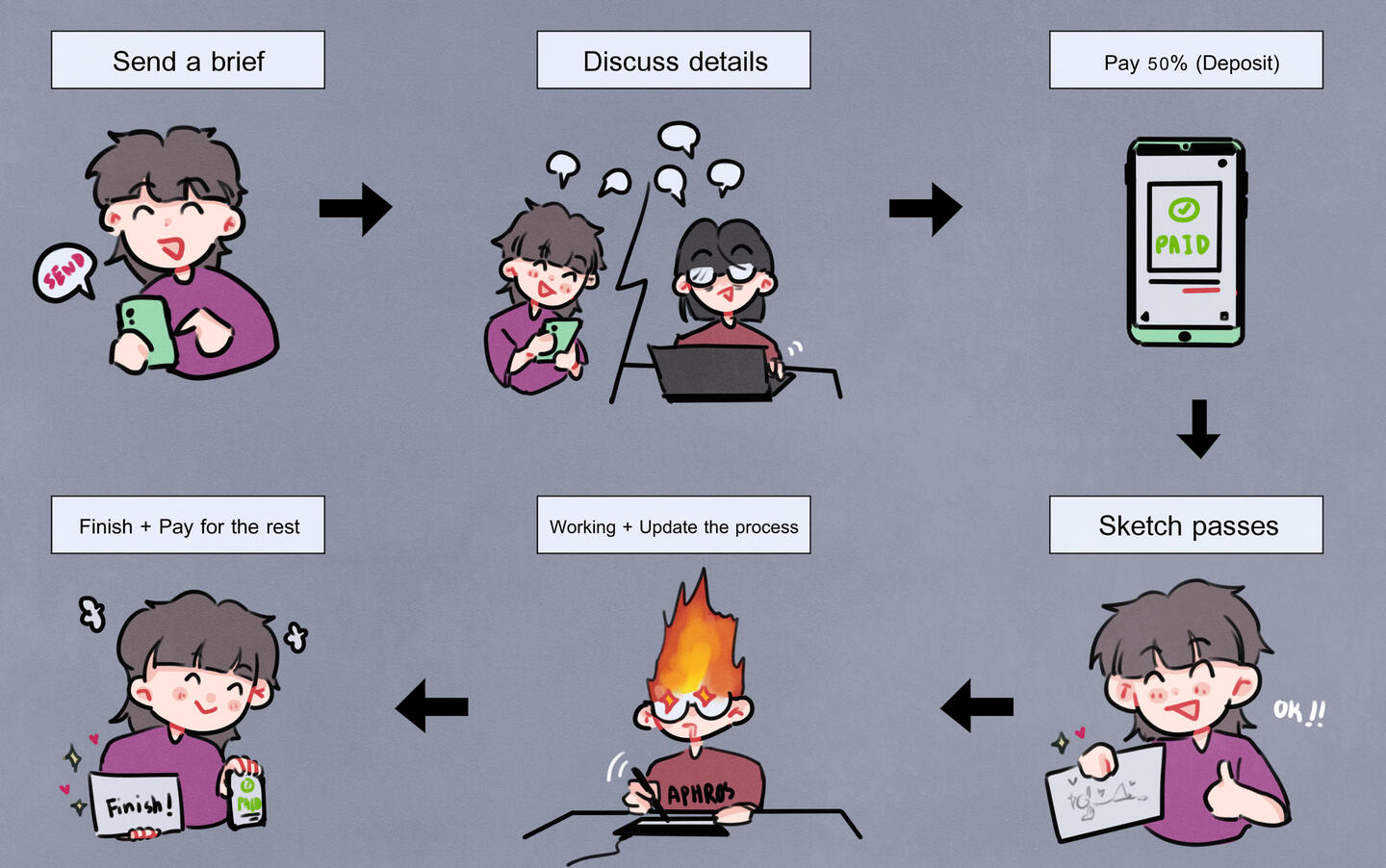 I'll contact you after I check the brief to discuss details.2. After I accept your request, you have to pay 50% as a deposit. (within 2 days)3. After we agree about sketch I'll continue the process and keep update to you.4. When the work is finished you have to pay for the rest then I'll send original file without water mask.